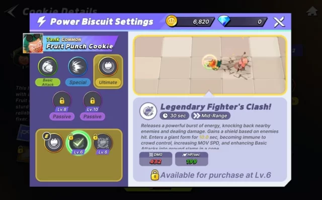 Legendary Fighter’s Clash!: Releases a powerful burst of energy, knocking back nearby enemies and dealing damage. Gains a shield based on the number of enemies hit. Enters a giant form for 10.0 sec, becoming immune to crowd control, increasing MOV SPD, and enhancing Basic Attacks into ground slams in a cone.