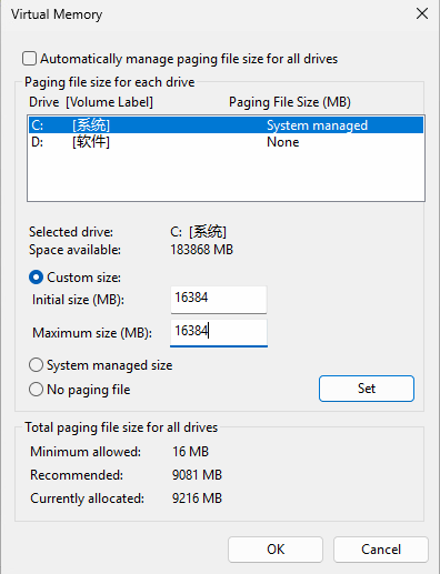 • Set the Initial size (MB) and Maximum size (MB) to 16384.