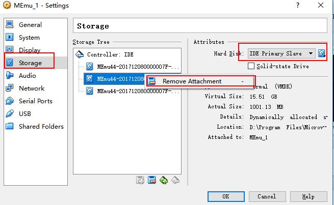 4. Choose MEmu_1(Broken), Click Settings > Storage, Choose Primary Slave Storage and right-click, Remove Attachment and Click OK. Then we will see it removed