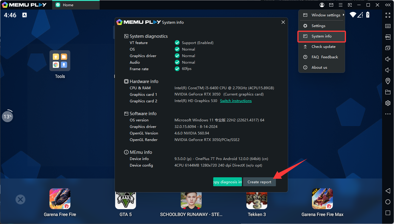 1. If you can open MEmu despite installation failure, you can find the install log path in system info. Click the “Create Report” button and the failure log will be generated on the desktop, and then you are able to send it to us.