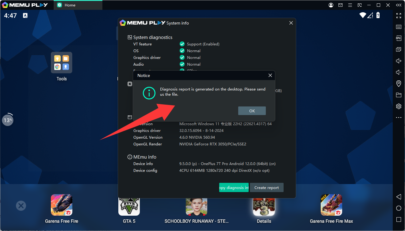 If the problem still persists, create a diagnostic report in MEmu and contact support for further assistance.