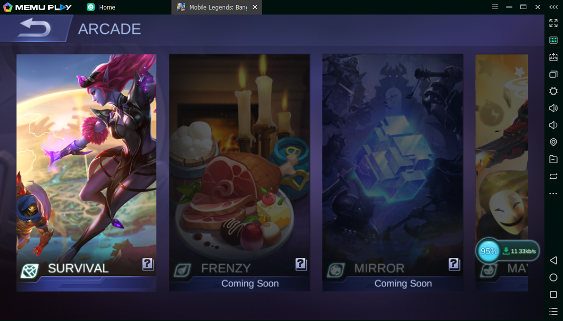 Kalau kamu bosan dengan mode peringkat, pada mode arcade juga disediakan beberapa pilihan, dimana setiap arcade memiliki gameplay yang berbeda. Seperti arcade survival, dengan gameplay yang menyerupai battle royale.