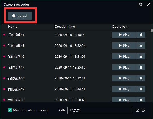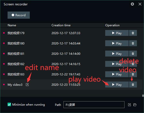 You can play it or delete it. The recorded video is stored in the “Path” shown in the figure, and you can browse or modify the path to it.
