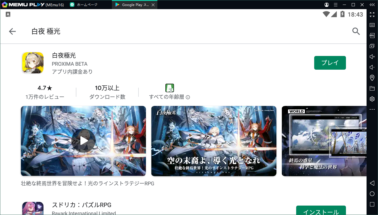 2.エミュレータ内のGoogle Playから「白夜極光」を検索し、ダウンロードします。あるいは、Apkpureのようなサードパーティからダウンロードし、apkファイルをMEmuにドラッグしてもいいです。