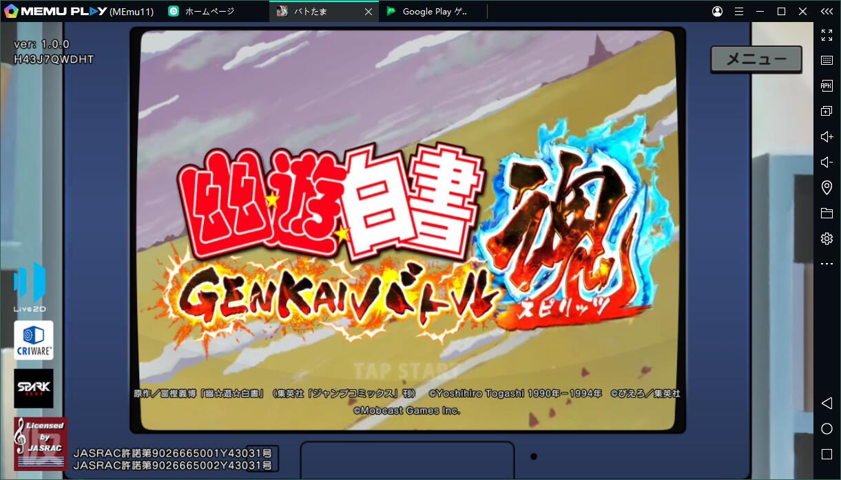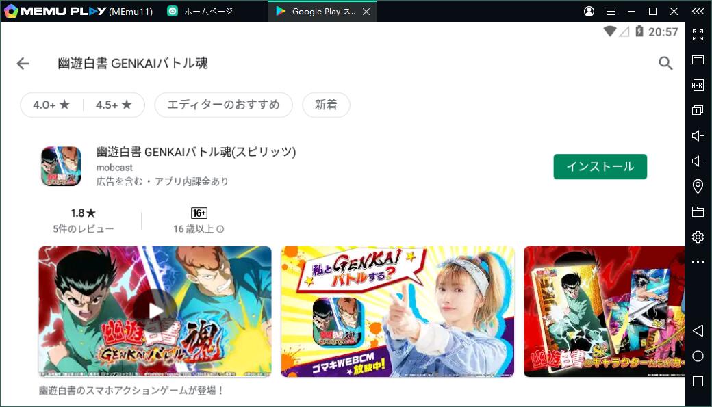 3.エミュレータ内のGoogle Playから「幽遊白書 GENKAIバトル魂(スピリッツ)」を検索し、ダウンロードします。あるいは、Apkpureのようなサードパーティからダウンロードし、apkファイルをMEmuにドラッグしてもいいです。