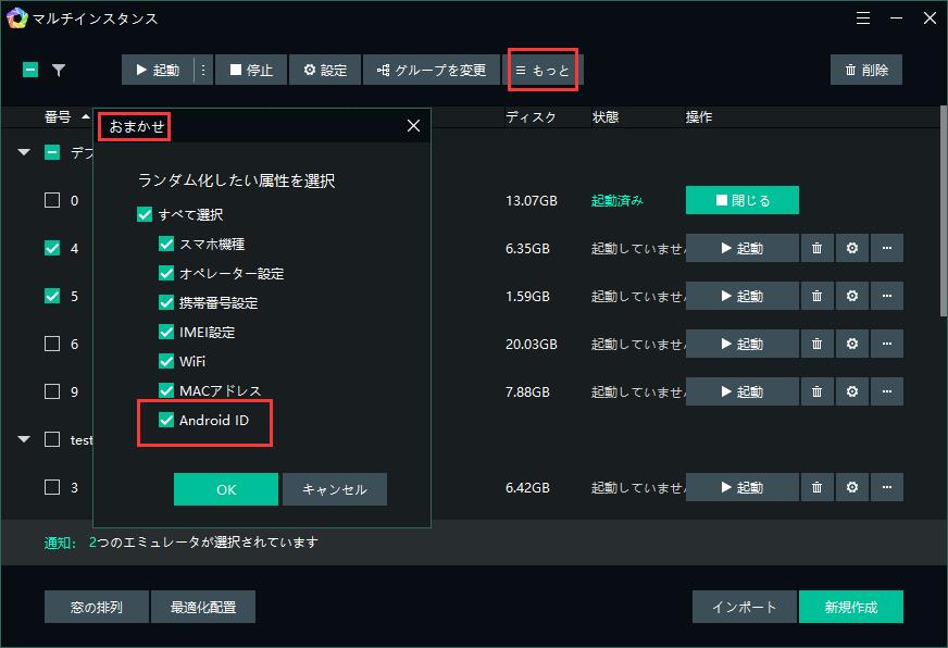 二、「マルチインスタンス」で「おまかせ」機能を使います。クローンされたエミュレータのパラメータをランダム化します(Android IDが重要)。