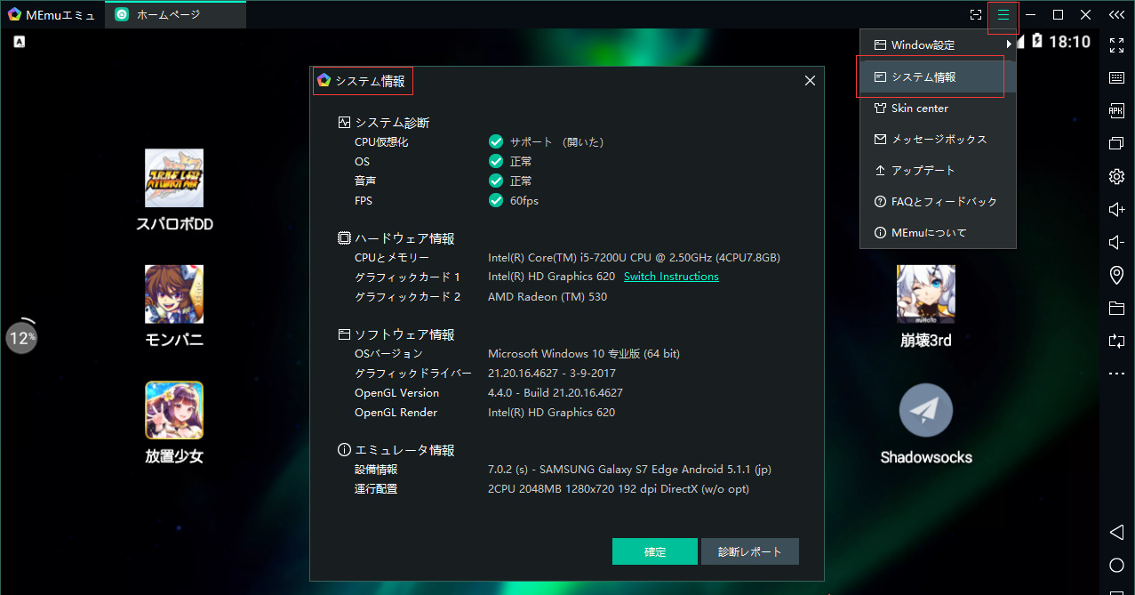システム情報(MEmuウィンドウの右上隅にある「システム情報」をクリック)