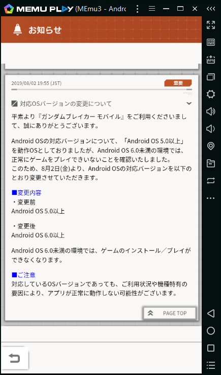 「ガンダムブレイカーモバイル」公式Twitterおよびゲームのお知らせによリ、「ガンブレ」の対応OSがAndroid6以上に変更致したとのこと。