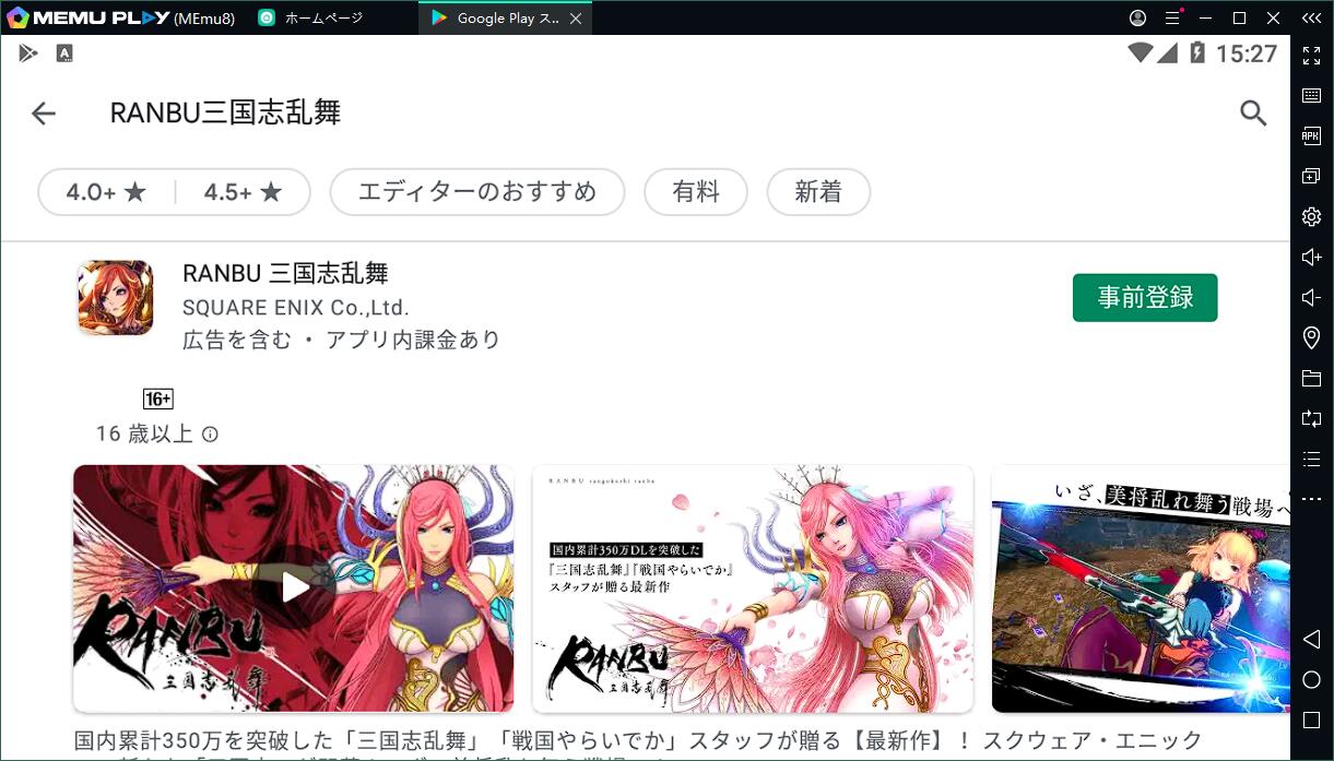 2.MEmuをインストールした後、エミュレータ内のGoogle Playから「RANBU 三国志乱舞」を検索し、ダウンロードします。あるいは、Apkpureのようなサードパーティからダウンロードし、apkファイルをMEmuにドラッグしてもいいです。