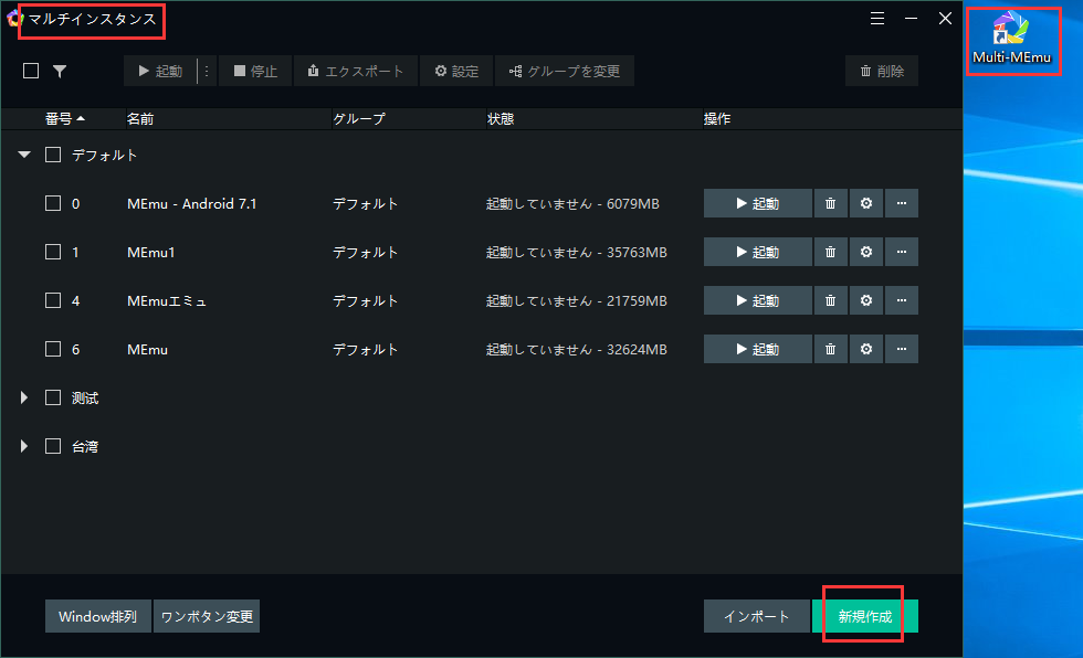 デスクトップの「Multi-MEmu」を開き、新規作成してください。