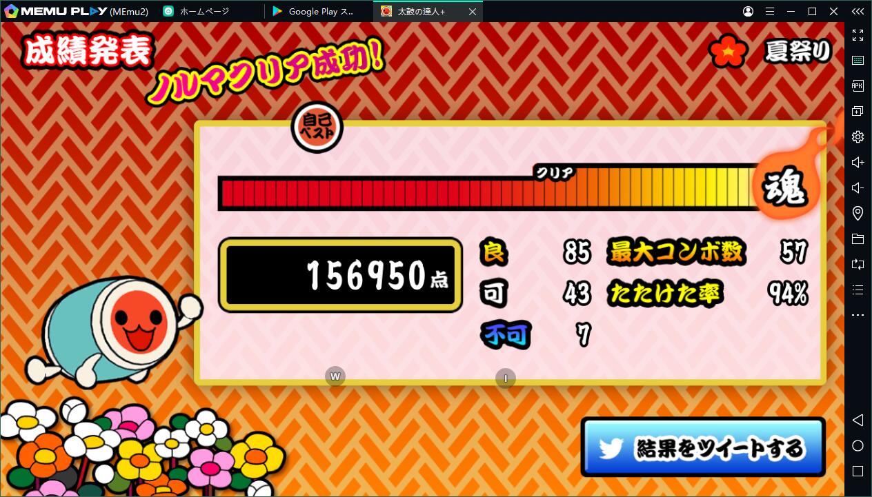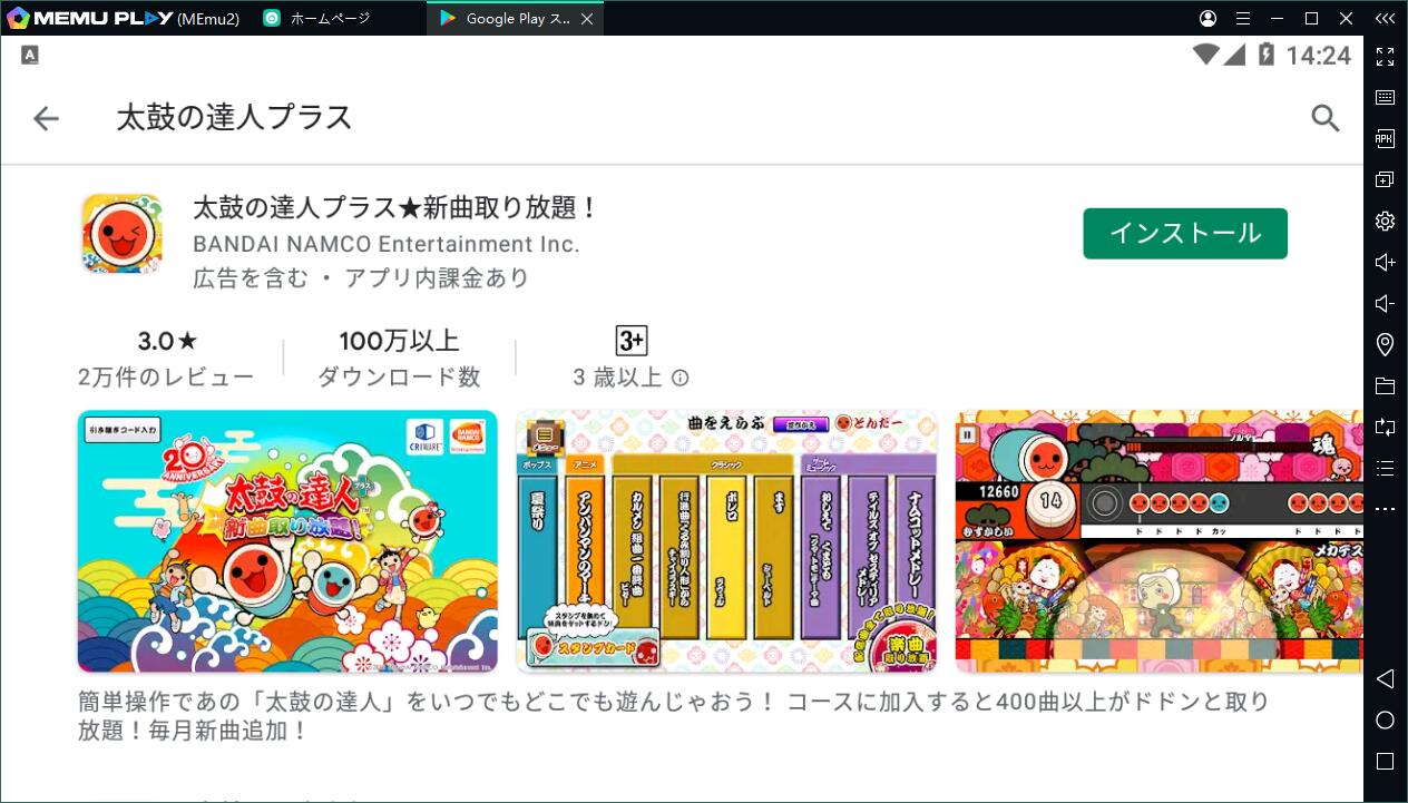 2.エミュレータ内のGoogle Playから「太鼓の達人プラス」を検索し、ダウンロードします。あるいは、Apkpureのようなサードパーティからダウンロードし、apkファイルをMEmuにドラッグしてもいいです。