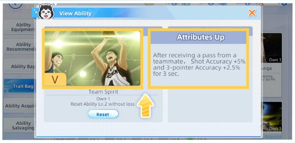 Trait function like passive skills, improving a player’s actual in-game performance, such as shooting accuracy, rebounding, and blocking. Once equipped, the player gains the corresponding stat enhancements.