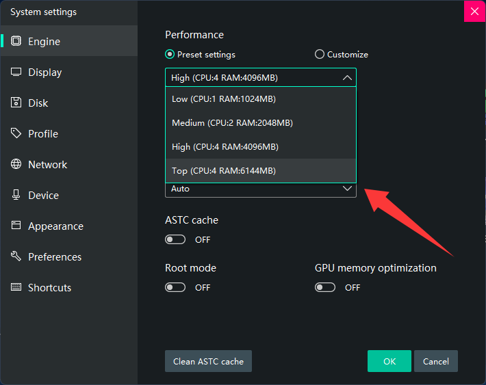 Go to Settings → Engine: