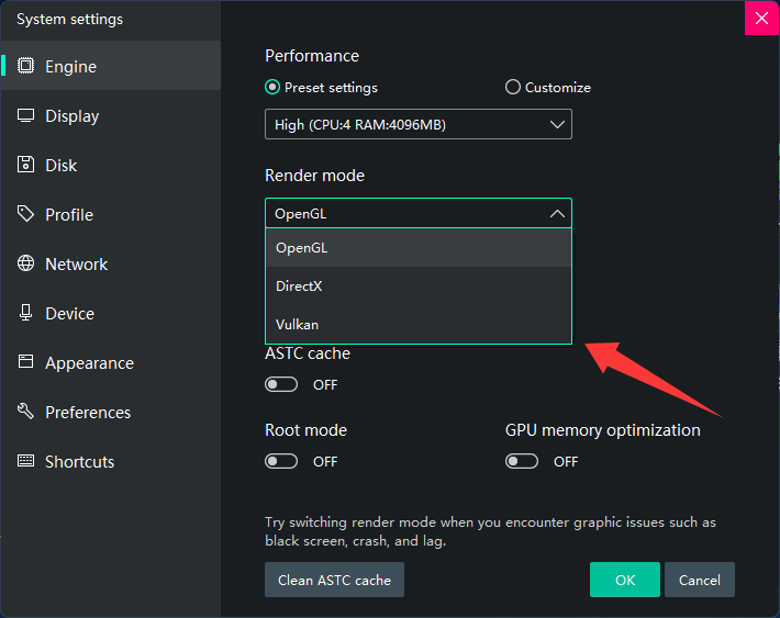 - DirectX → Best stability (recommended)