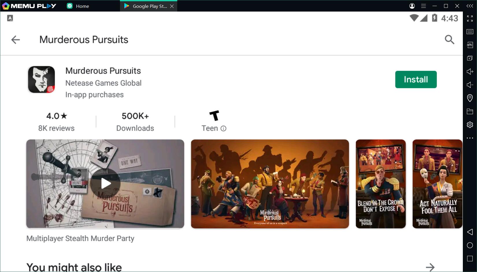 The instructions below will teach you how to easily play Murderous Pursuits Mobile with MEmu.