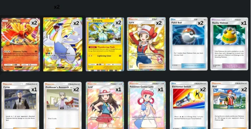 The first Ho-Oh ex deck that you want to use is the Lugia ex deck, which pairs the two legendary beasts with various support cards to ensure they can both shine. The only other Pokémon is Zeraora, who utilizes the Elemental Switch support card to rotate energy.
