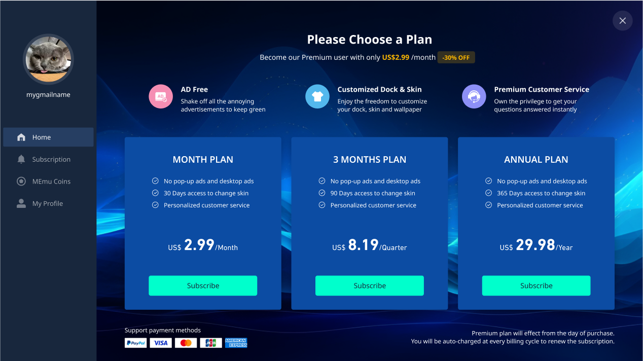 This tutorial will help you to purchase the premium subscription on MEmu (Version 7.2.1 and up). To check the benefits of our premium member, please visit: A Brief Introduction of MEmu Premium