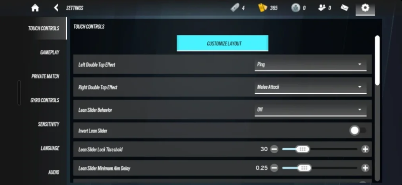 Turn off the left double-tap effect and disable all double-tap actions. Remove the lean slider, bind Vault to the Space key, set Gadget to your mouse thumb button, and assign Melee to F.