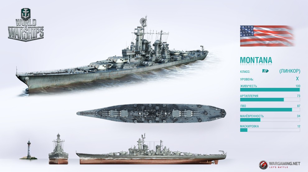 X Montana — лучший американский линкор. Монтана стреляет заметно точнее и кучнее чем X Yamato. Имеет более узкие габариты и хорошую маневренность. Если прокачать оружейные башни, то скорость их разворота будет почти как на крейсере. Многие считают его лучшим линкором в World of Warships.