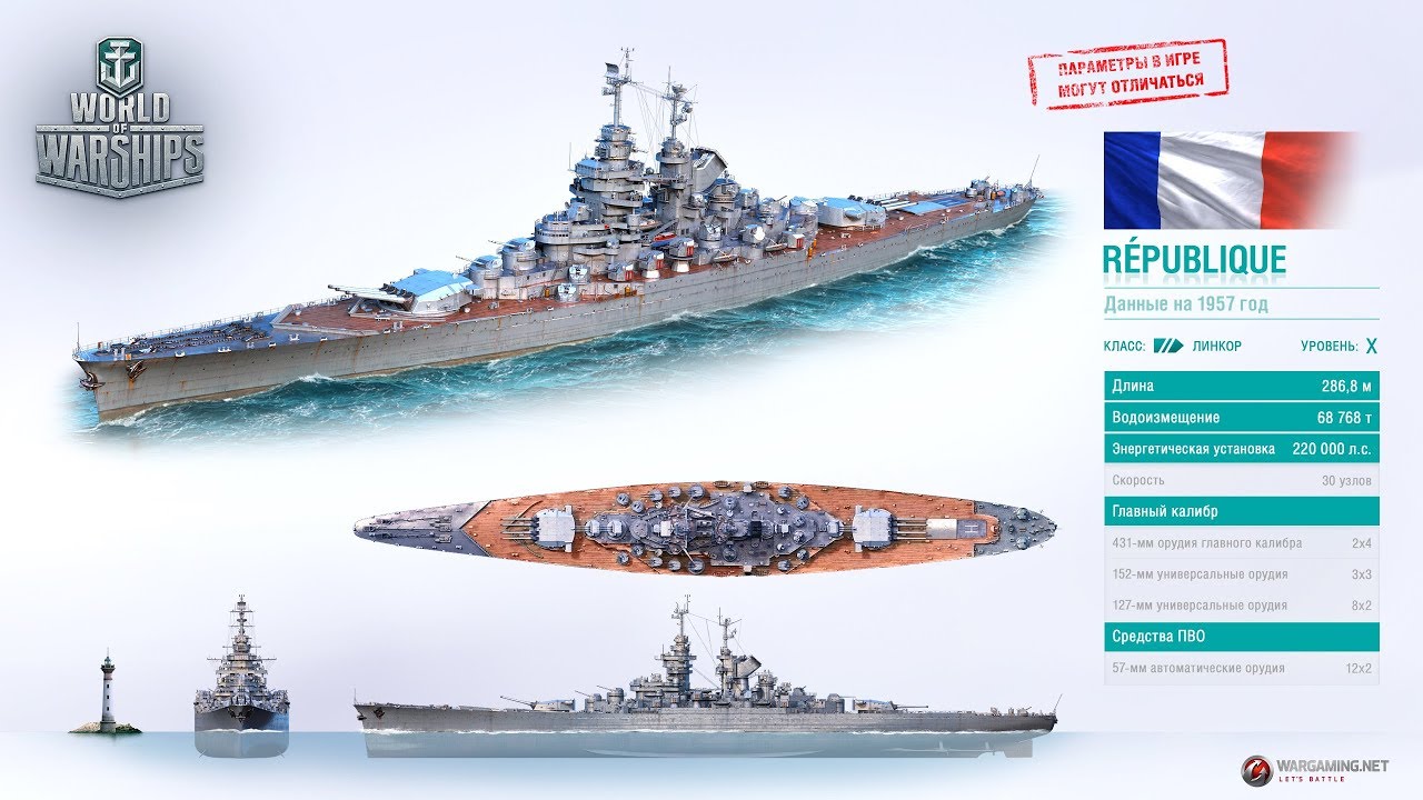 X République — лучший французский линкор на котором установлены две четырехствольные башни артиллерии. Небольшое количество орудий компенсируется достаточно быстрой перезарядкой. Линкор имеет хорошую точность на любых дистанциях и высокий шанс на пробитие. Также линкор достаточно быстрый и имеет способность «Форсаж». Из минусов слабая живучесть. Попасть в фокус кораблей противника на этом линкоре значит почти гарантированно пойти на дно.