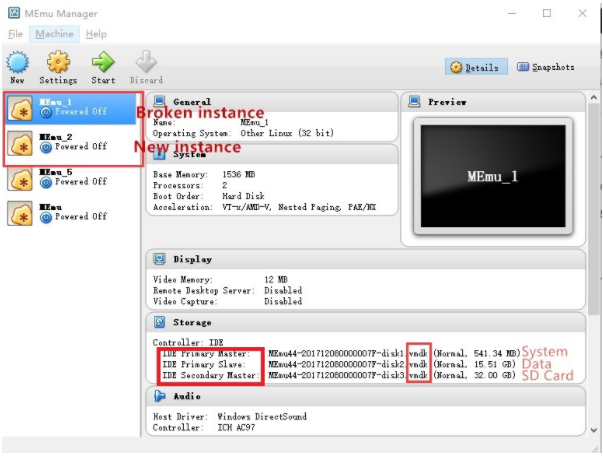 4. Нажмите кнопку Настройки Для MEmu_1 и проверьте последовательность из 3 дисков. Правильная последовательность – ” система (540 МБ) – > данные(16 ГБ) –> sd-карта (32 ГБ)”. Если они не в порядке, пожалуйста, снимите их и прикрепите снова.