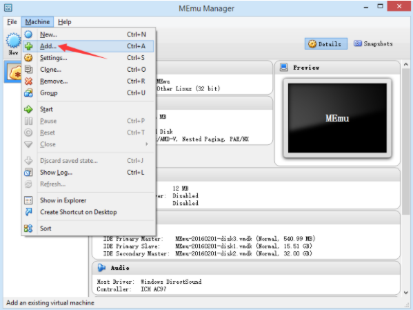 2. Нажмите кнопку Добавить в MemuHyperv