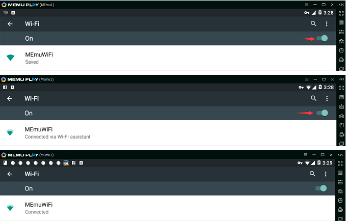 2.Проверьте состояние Wi-Fi Android (MEmu). Например, сохраненные или подключенные через Wi-Fi assistant являются ненормальными, просто нажмите кнопку переключателя, чтобы убедиться, что он переключается на подключенный.