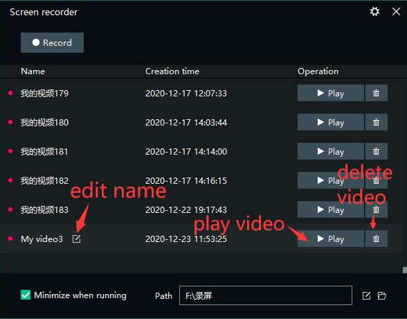 Вы можете воспроизвести его или удалить. Записанное видео хранится в “пути”, показанном на рисунке, и вы можете просмотреть или изменить путь к нему.