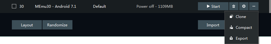 Примечание: Если эмулятор находится в запущенном состоянии, функции Clone, Export и Compact не могут быть реализованы.