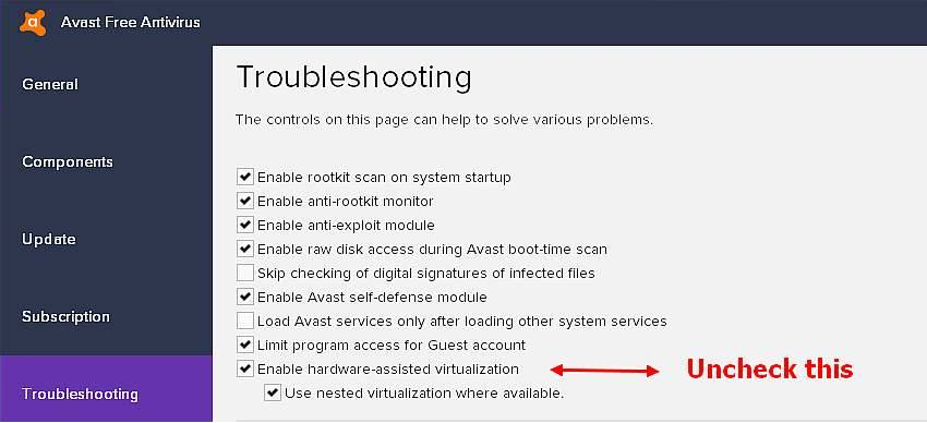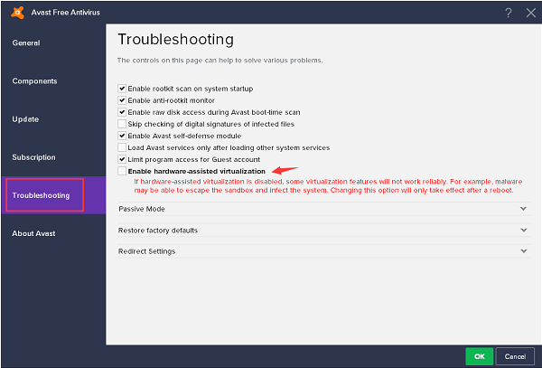 1.Если AVAST или AVG существуют на вашем компьютере, пожалуйста, отключите аппаратную виртуализацию при устранении неполадок и перезагрузите систему. Иногда он будет включен после определенного обновления.