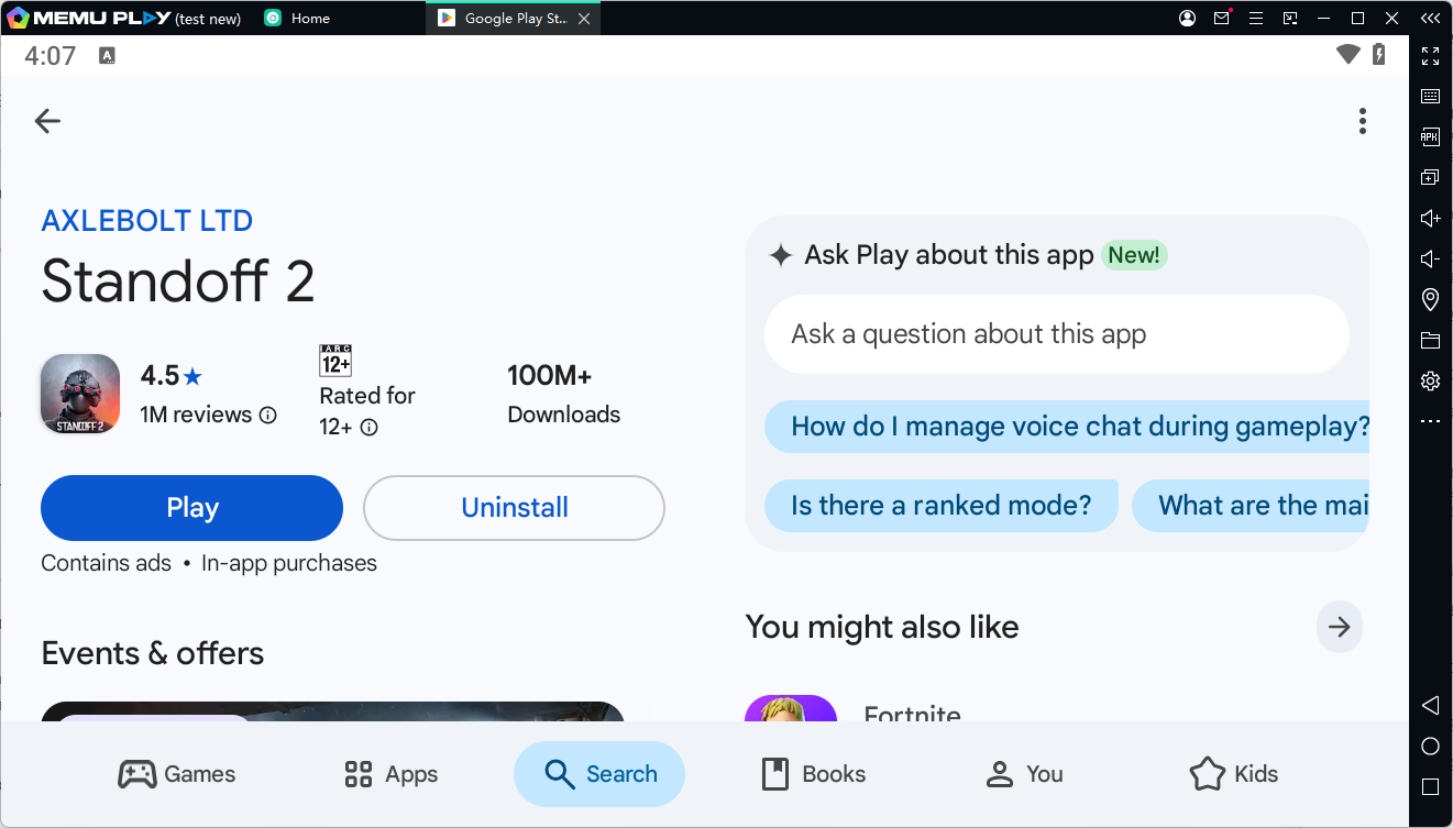 2. Установи игру: Открой Play Store внутри эмулятора, войди в аккаунт и скачай Standoff 2.