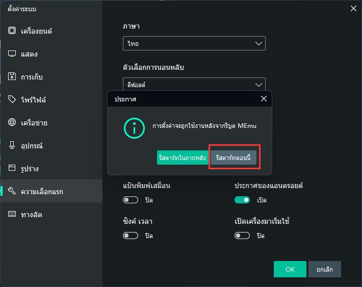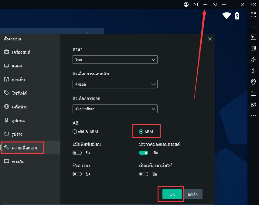 จากนั้นไปที่ การตั้งค่าระบบ ในหน้า ค่ากำหนด ให้เปลี่ยนการตั้งค่า ABI เป็น ARM แล้วคลิก ตกลง (OK) และรีสตาร์ทโปรแกรม MEmu Play