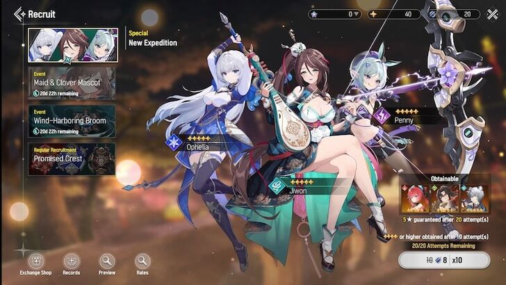 ในฐานะผู้เล่นวันแรก คุณจะได้รับ 20 ตั๋วมาตรฐาน จากของขวัญลงทะเบียนล่วงหน้าเพื่อใช้ที่ แบนเนอร์ 1. เกมนี้ใจดีกับรางวัลเคลียร์หนึ่งครั้ง