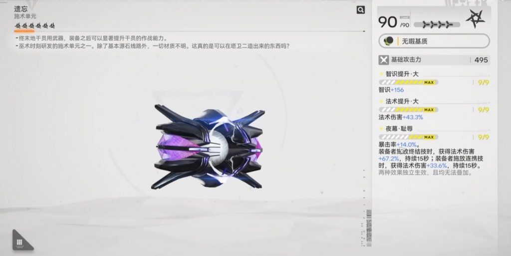 這把武器本身性能出色,主屬性提供156點智識、43.3%法術傷害加成與14%暴擊率,能顯著提升法術輸出。