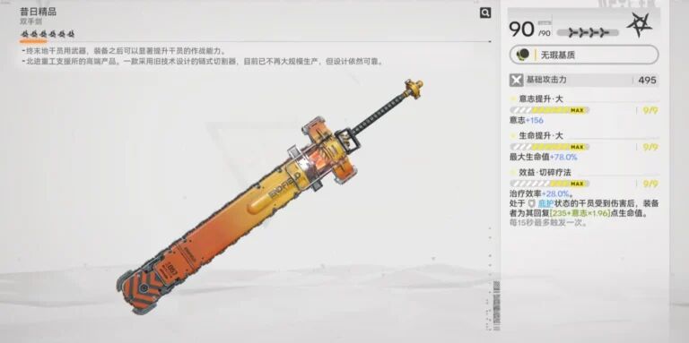 這是一把定位為盾系輔助使用的雙手劍,但當前版本收益很低。主要原因是其上位替代品更容易獲得(如晝雪的 【終點之聲】),且核心防禦角色(如餘燼)通常擁有更專屬的裝備(如 【大雷斑】)。將寶貴的六星自選資源用於此處,性價比極低。