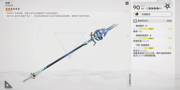 這是一把側重爆發的輸出武器。其核心機制在於:使用普攻最後一擊命中敵人後,可獲得28%攻擊力加成(主控幹員時效果翻倍至56%),同時該次攻擊能造成更高的失衡值。