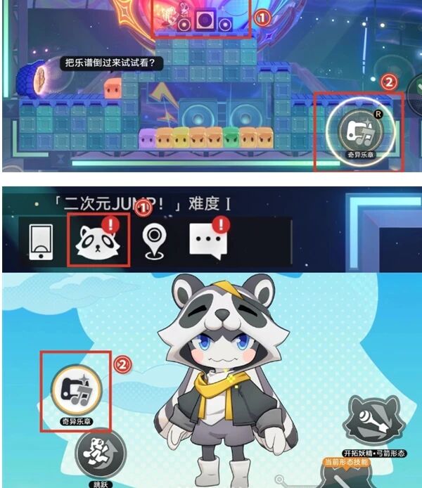 2. 彈奏樂章:靠近裝置後,點擊左上角的浣熊圖示,選擇【奇異樂章】並彈奏指定的樂譜。