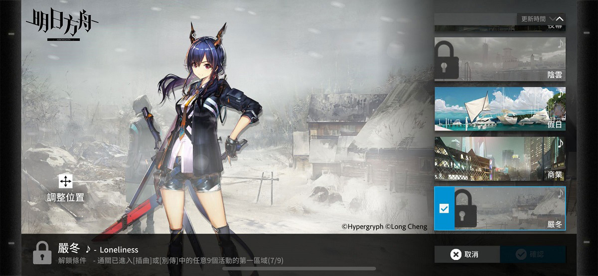 更新後玩家可以進行首頁的場景更換,切換場景同時音樂也會進行切換,只要滿足「未解鎖」場景的「解鎖條件」,即可解鎖使用對應的場景,本次將新增場景「夜幕」、「陰雲」、「假日」、「商業」、「嚴冬」,後續將陸續新增其他場景。