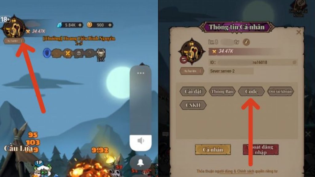 Bước 1: Vào game và bấm chọn vào avatar ở góc trên, bên trái màn hình. Sau đó bấm vào chữ Code ở hộp thoại vừa hiện ra.